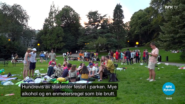 Slik er det i Bergen også. NRKs reporter Mette Anthun hadde tatt turen til Nygårdsparken, der det var tydelig at de unge tok relativt lett på henstillingen fra myndighetene. Her intervjuet hun et par festdeltakere hvorav den ene muligens var noe forfrisket av medbragte drikkevarer.